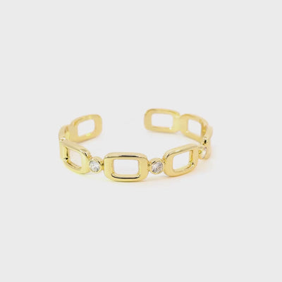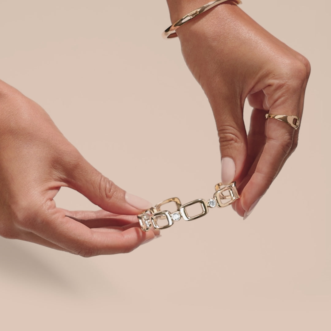Designed to sit comfortably on the wrist, this cuff bracelet feels both bold and wearable. The square link cuff design introduces a tailored, architectural structure, softened by polished edges while the cubic zirconia accents offer an elegant, feminine finish. Crafted in 14k gold over brass, this adjustable cuff bracelet is timeless in design and easy to wear from day to night.