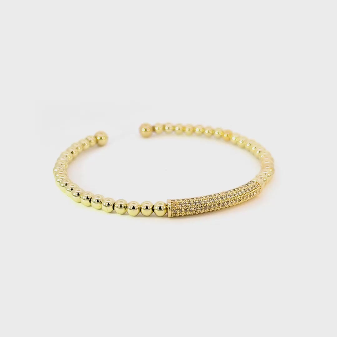 The Muse Solène cuff bracelet features polished gold beading, centered by a cubic zirconia pavé-accented center bar that adds a touch of glimmer. The adjustable open cuff silhouette feels light on the wrist, while the contrast of smooth metal and delicate sparkle creates an effortlessly elevated finish. Crafted in 14k gold over brass and designed to layer beautifully or stand on its own, this piece brings understated elegance to everyday wear.
