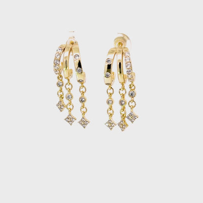 Designed to make an impact, these layered huggie earrings crafted in 14k gold over brass feature cascading chains adorned with diamond shaped cubic zirconia charms. Featuring a trio of embellished hoops, designed to hug the ear comfortably, this statement style brings bold impact to everyday dressing and elevates evening looks with ease.